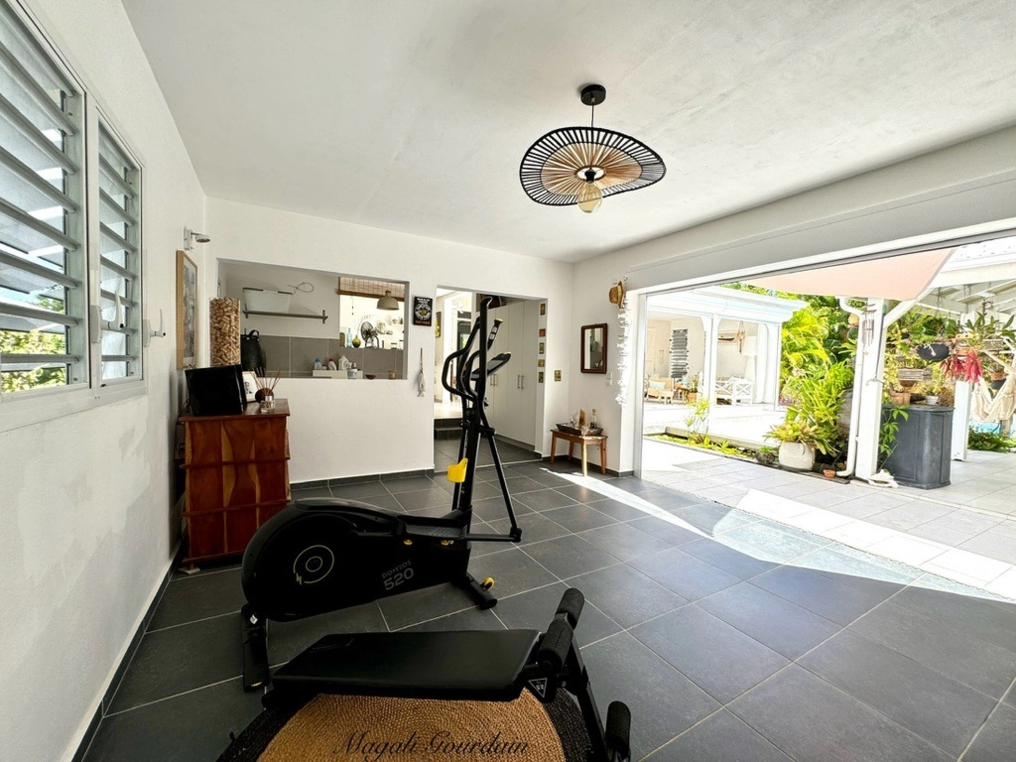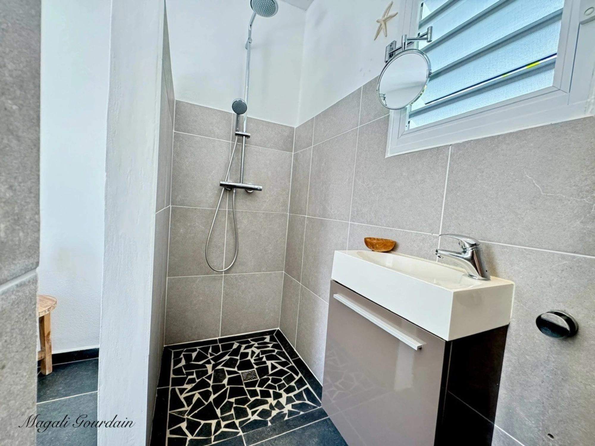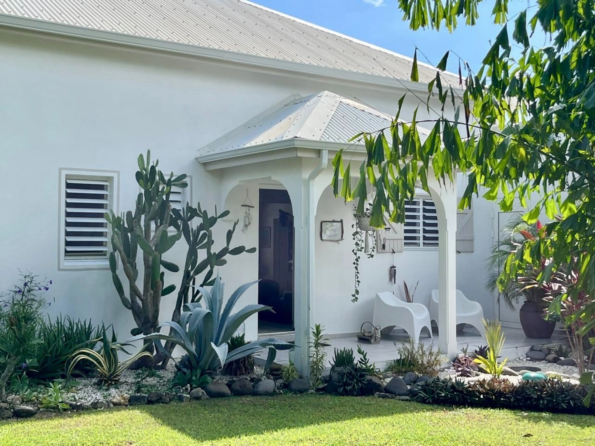 The landscaped grounds of over 1000 m² are fully enclosed and home to a variety of fruit trees, including avocado, banana, guava, local cherry, papaya, pitaya, and coconut trees. A salt-water swimming pool and a large carbet complete this idyllic space.