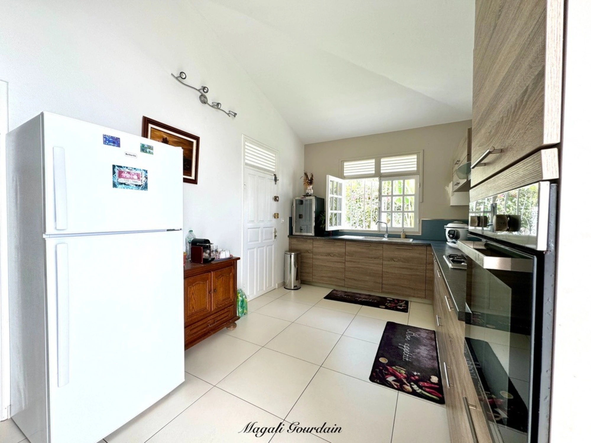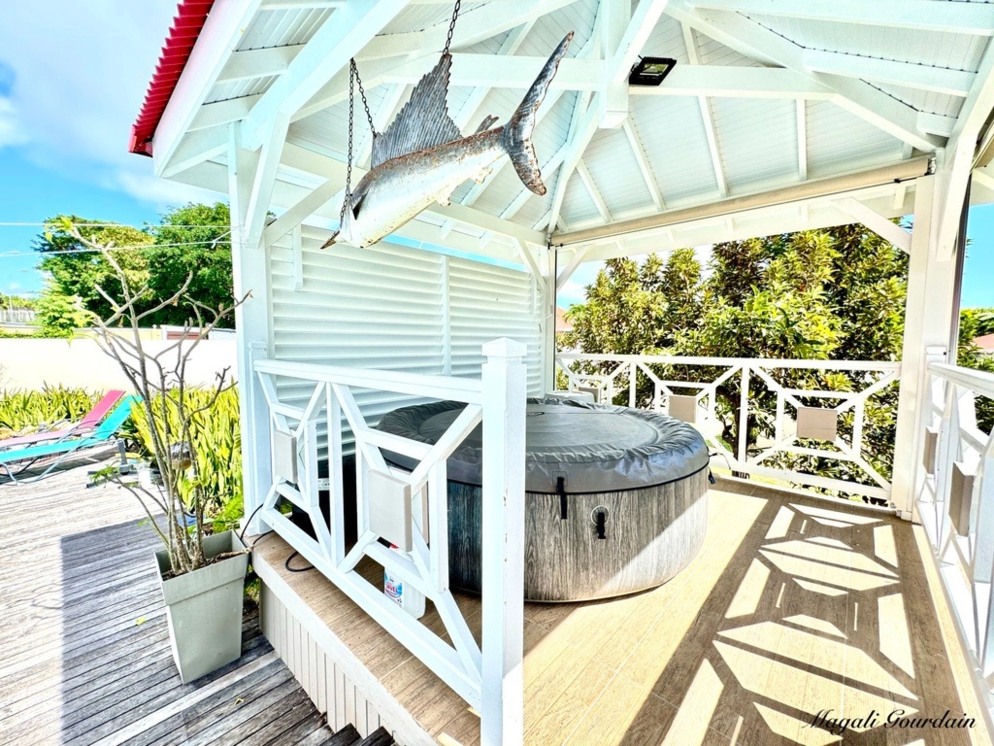 A raised carbet will allow you to enjoy moments of relaxation outdoors, currently equipped with a spa with blinds for more privacy. The villa also includes a large spacious garage to park your vehicles, as well as two entrances with motorized gates for added security and comfort. It is connected to the mains drainage, a buffer tank to compensate for water cuts and has an insulated and lined roof, guaranteeing optimal comfort throughout the year on each of the buildings. Located in a secure subdivision, this property offers easy access to the city center, the golf course, the casino and the beaches of Saint-François, making the location extremely convenient.